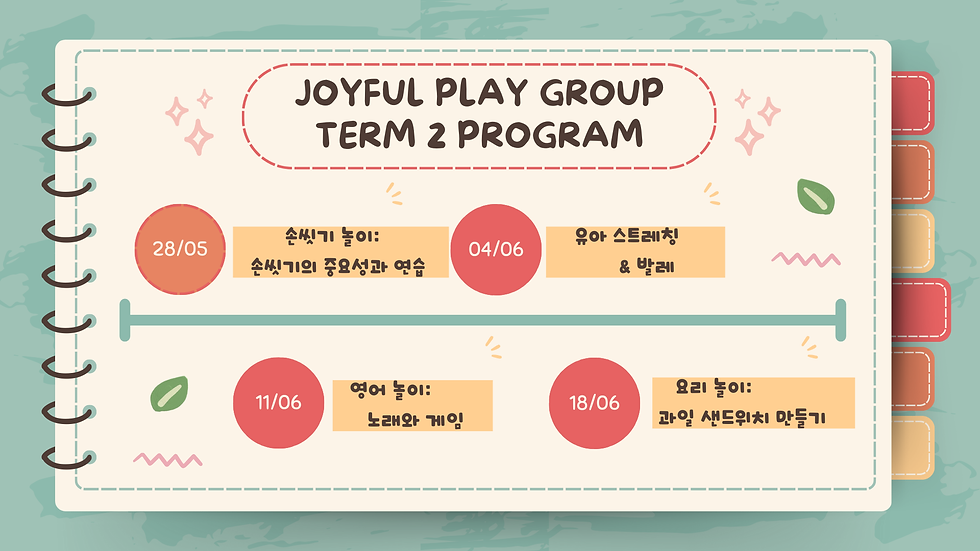 내일 4월 30일 수요일 부터 텀2 플레이 그룹이 시작 됩니다.부모님들과 아이들 모두 이번텀에도 Joyful한 일정되시길 바라는 마음으로 준비 했습니다.점점 추워지는 멜번 날씨에도 우리모두 건강해서 매주 만나길 바래요.